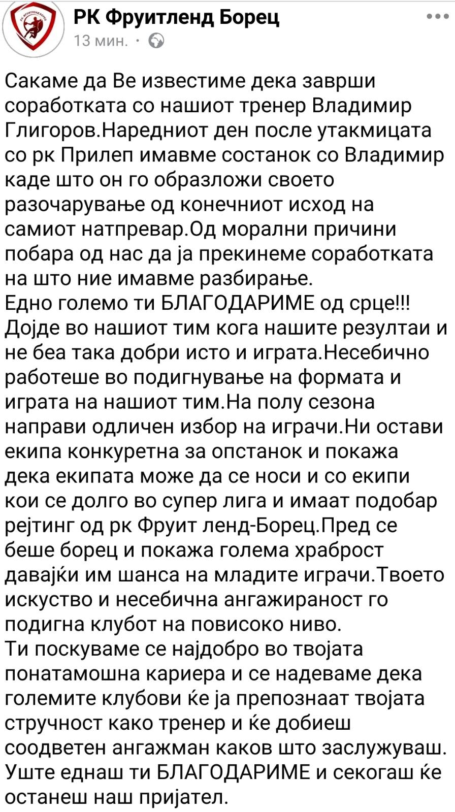 Дебитантот во Супер лигата, Борец Фрутиленд, во понатамошниот дел од сезоната, односно во борбата за опстанок ќе биде предводен од нов тренер, откако денеска велешкиот клуб го потврди заминувањето на Владимир Глигоров.