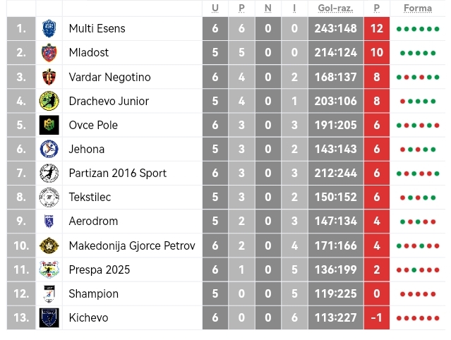 По шест одиграни кола, Мулти Есенс има максимален ефект, шест победи од шест средби и вкупно 12 бода. Веднаш зад него е Младост со 10 бода, но тимот од Богданци има еден натпревар помалку, бидејќи беше слободен во првото коло.