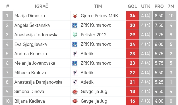 Михаела Кралева и Анастасија Дамјановска, двете членки на новиот клуб Атлетик, се последните ракометарки кои ја надминаа границата од 20 погодоци – првата има 22, а втората 21 гол на четири натпревари.