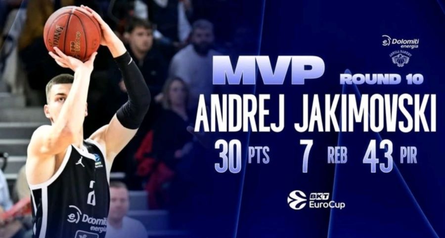 Андреј Јакимовски продолжува да го привлекува внимание во европската кошарка. Македонскиот репрезентативец, кој настапува за Тренто, доби големо признание, избран е за МВП на 10. коло во Еврокупот по феноменалното издание против француски Бург.