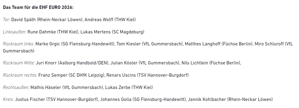 Меѓу 18-те имиња не се најде левото крило Тим Фрајхофер, кој игра одлично во дресот на Фуксе Берлин. 23-годишниот ракометар изјави дека е разочаран, но ја прифаќа одлуката на селекторот.