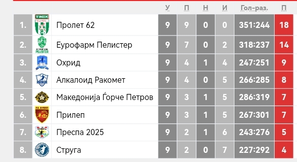 Пролет славеше против Македонија Ѓорче Петров со убедливи 48:31 за деветта сезонска победа. Освен Лука Јовиќ со десет погодоци, во победничката екипа се истакнаа уште Давор Крстески со девет, Марко Ѓорѓески со седум и Огнен Алексов со шест погодоци. Кај Македонија Ѓорче Петров, лидерот на листата на стрелци, бекот Никола Кузевски, постигна десет погодоци и сега зад своето име има вкупно 110 голови, односно просек од 12,2 по натпревар во досегашниот тек од сезоната.