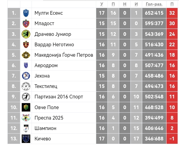 Претходно, Мулти Есенс немаше никакви проблеми против Кичево (55:20) и дојде до 16-та сезонска победа, со што моментално го презеде лидерското место на табелата, сега има два бода повеќе од Младост.