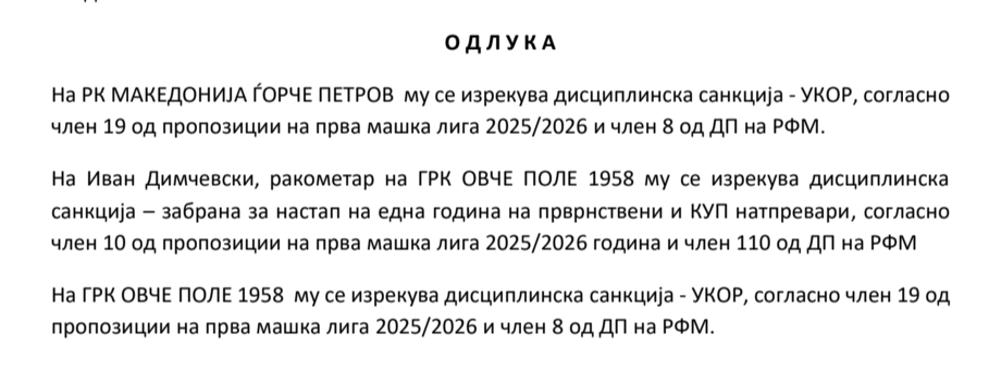 Во билтенот број 20 за Првата лига, се наведува дека и на РК Македонија Ѓорче Петров му се изрекува дисциплинска санкција – УКОР, согласно член 19 од пропозиции на прва машка лига 2025/2026 и член 8 од ДП на РФМ, и истото важи и за тимот од Свети Николе.