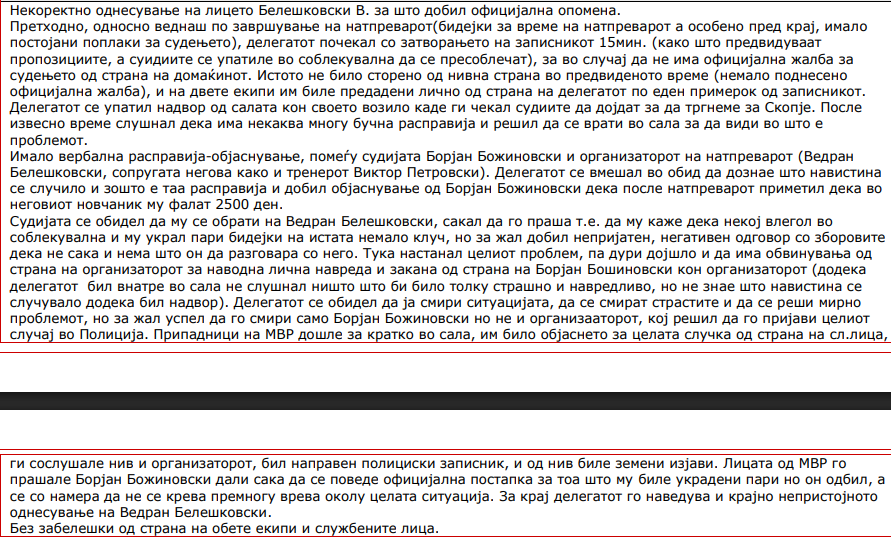 Според информациите, веднаш по завршувањето на средбата, Божиновски забележал дека му недостасуваат 2.500 денари, по што се обидел да стапи во контакт со организаторот на натпреварот. Наместо решение, ситуацијата ескалирала во вербална расправија во која биле вклучени и други лица од домашниот тим.